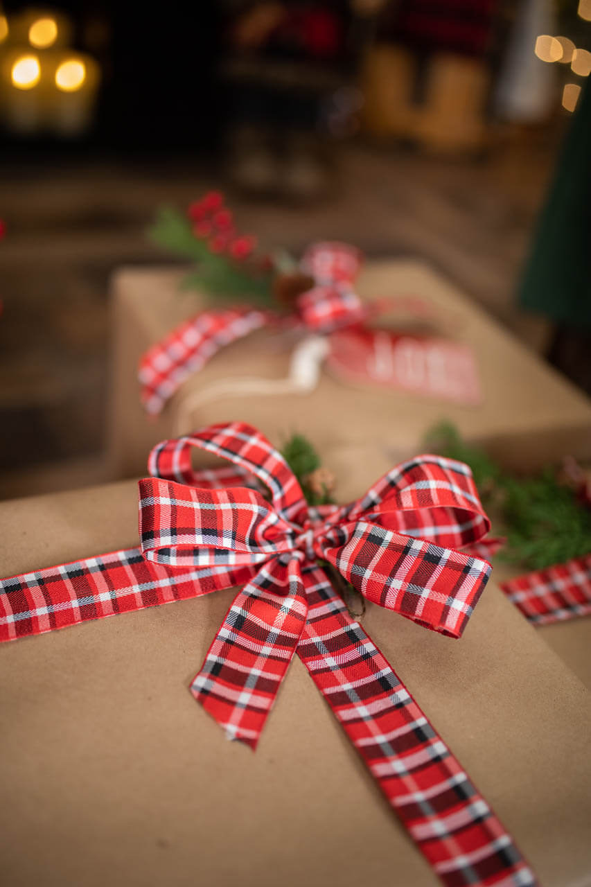 Kraft paper, red, white, and green always elicit classic vibes and bring in cheery nostalgic feelings. We love all the neutrals with pops of polka dots, contrasting green leaves and — you guessed it — more plaids! Ornaments are great because they add the shapes you need to bring visual interest and serve as a double gift.