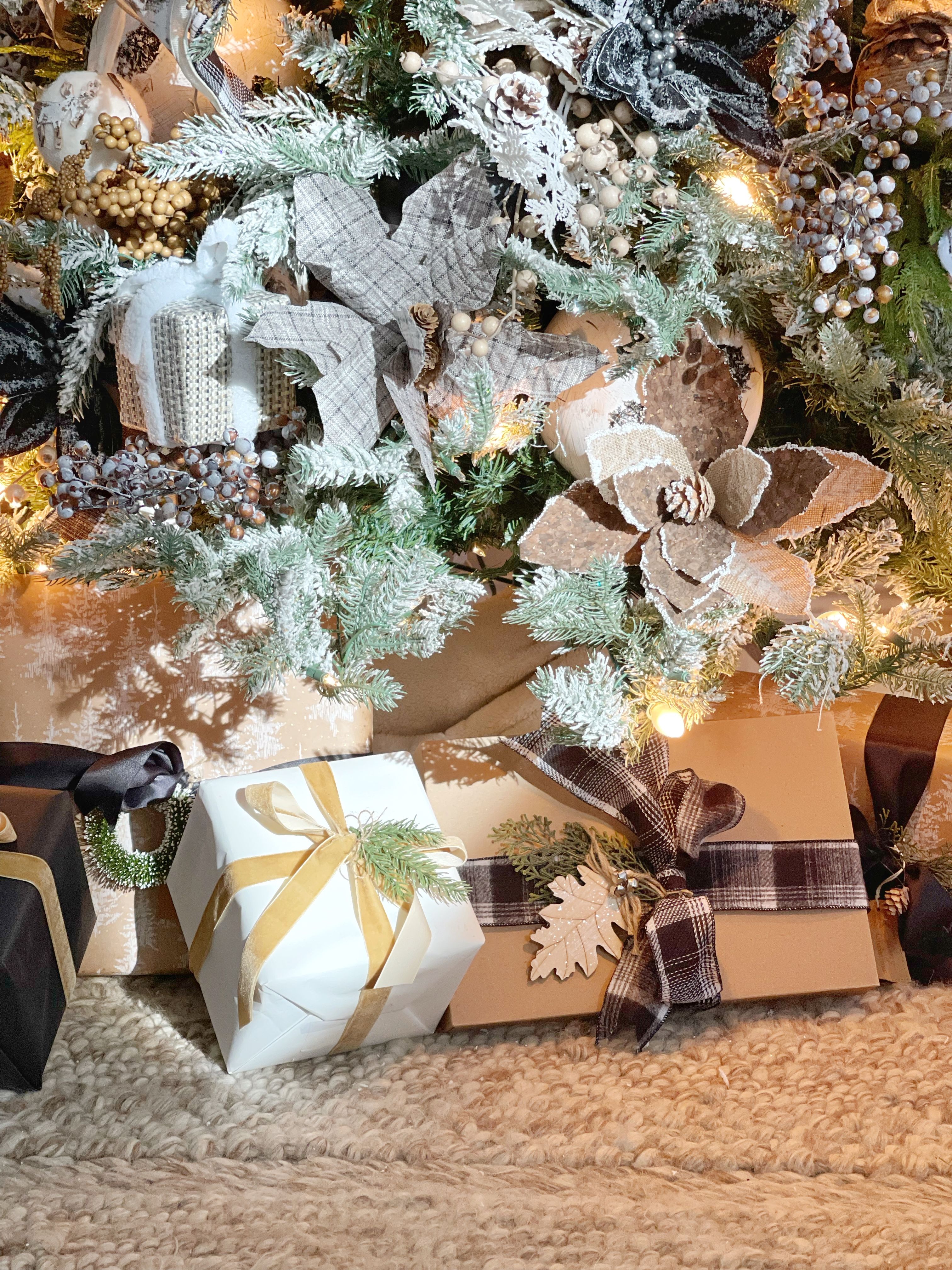 These gorgeous arrangements use soft neutrals and natural elements to bring the woodland vibes to any tree or gift! Birch, vintage patterns, and plaids are always fun to play with!