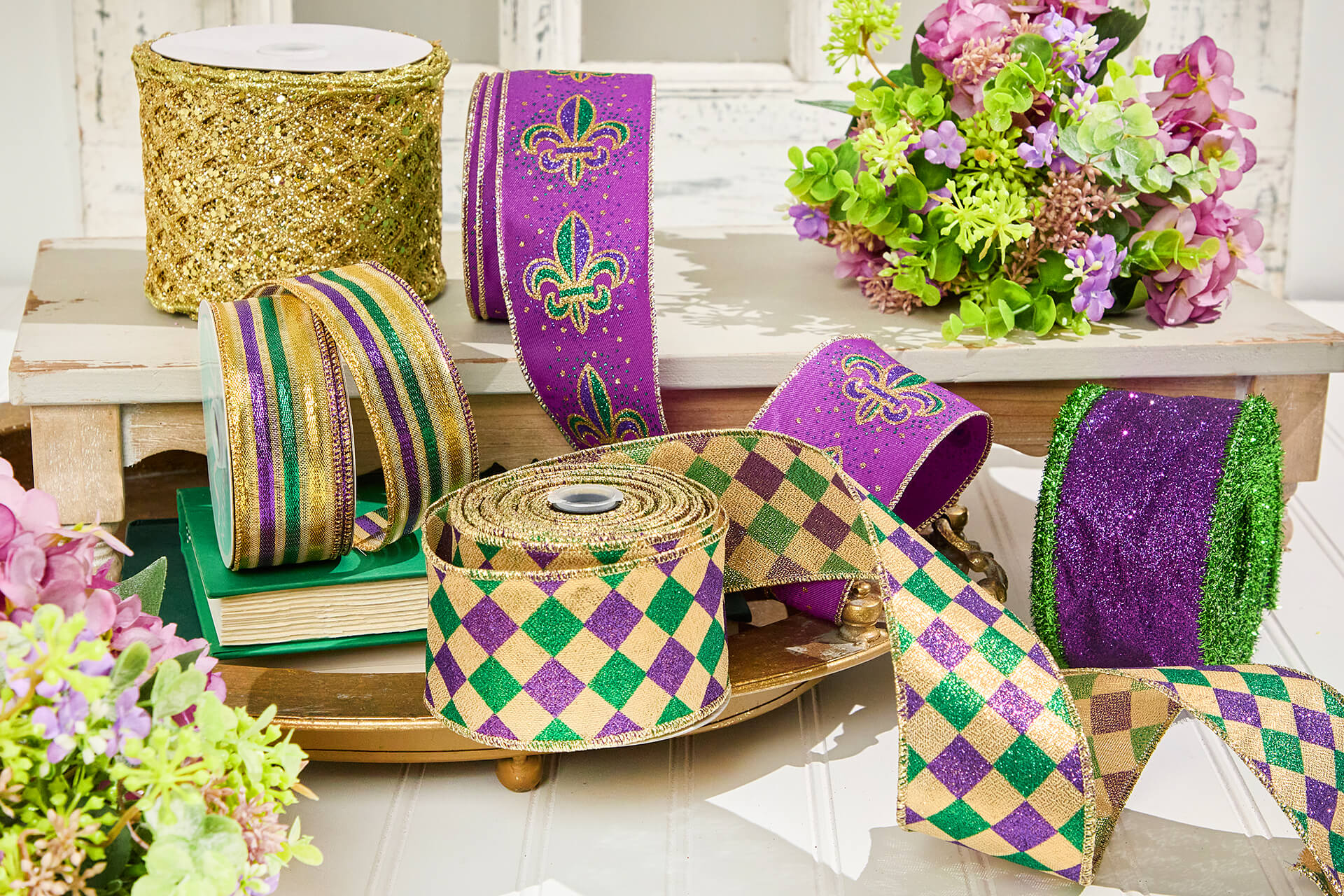 Use the ribbon to create oversized sashes, bows, cascading wreath tails, garlands, or other accents. Mixing two to three ribbon styles instantly elevates any Mardi Gras decor display.