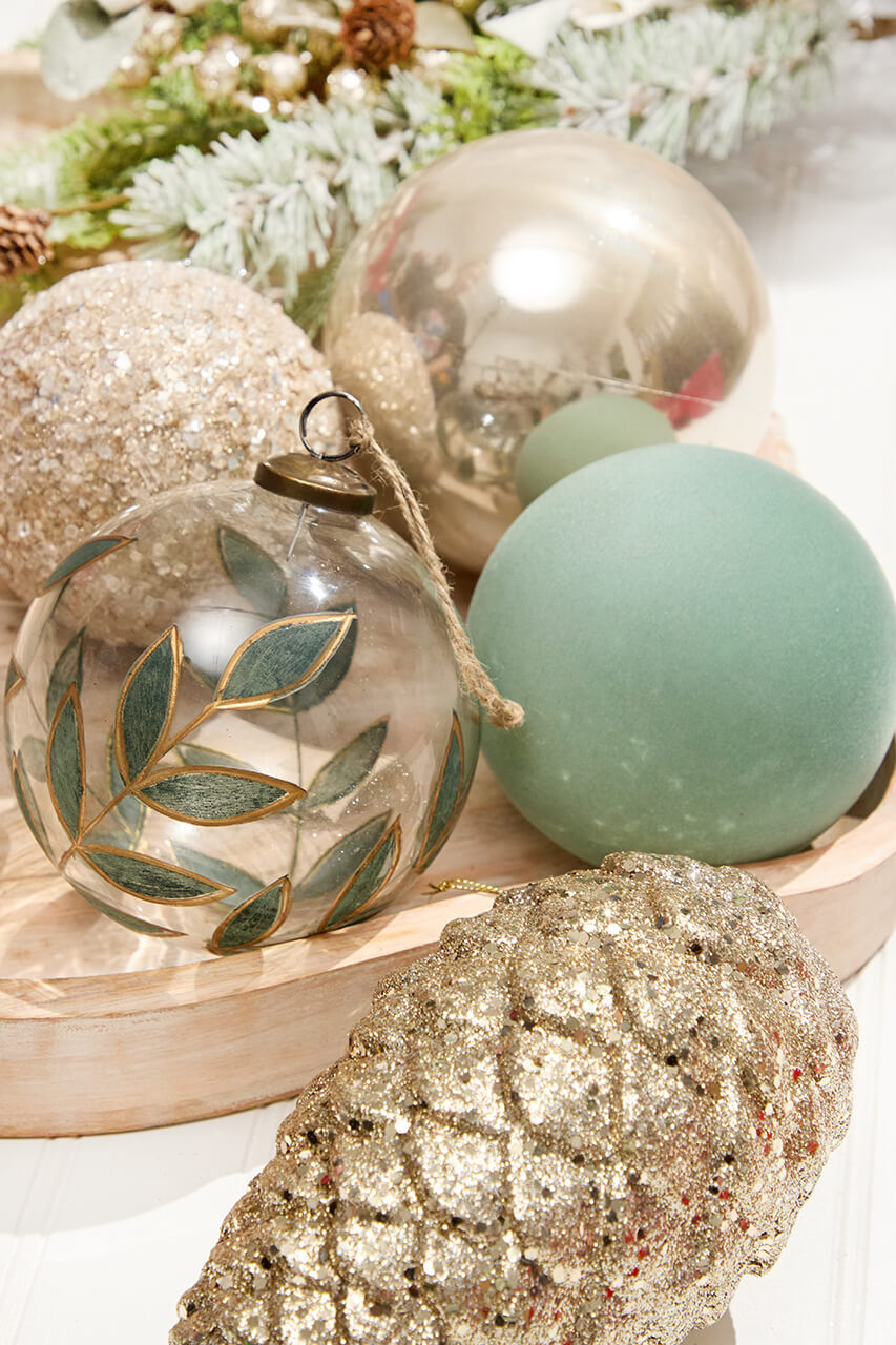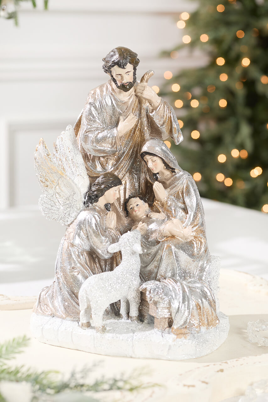 Our nativity decorations in the Oh Holy Night Collection are an inspired celebration of faith with traditional Christmas scenes, nativity ornaments, familiar images of the Christ child, and faith-inspired highlights. This collection of ornaments, ribbons, jingle bells, sprays, and decor exhibits subtle green-blues, some coastal accents, muted and natural whites, as well as gold and silver accents - perfect for “silver and gold” or sweet blue and neutrals themes as well as settings inspired by the true meaning of Christmas - Jesus. Take some inspiration from this collection and accent your home (or business) with a celebration of joy and hope this Christmas season!